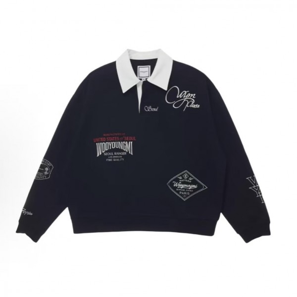 • 뒤로 우영미 SS25 자수 패턴 칼라 긴팔 스웨트셔츠 남성용 블랙 > 남성의류